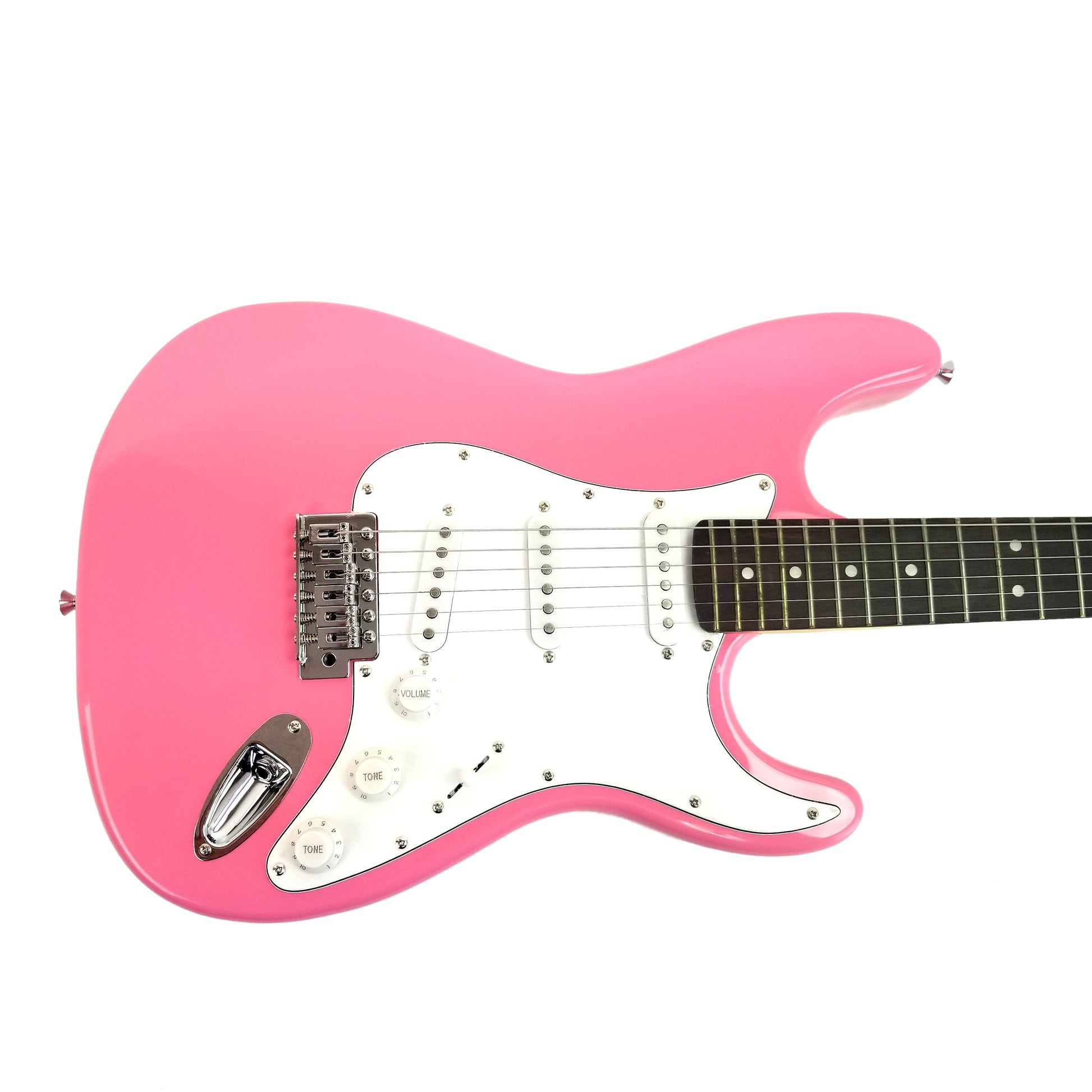 Zenison High Quality & Lightweight 39 inch electric guitar features C-shaped sturdy maple neck, engineer wood fretboard with fret position marks, 22 silver nickel frets, solid wood body with high gloss pink finish and tremolo bridge system.